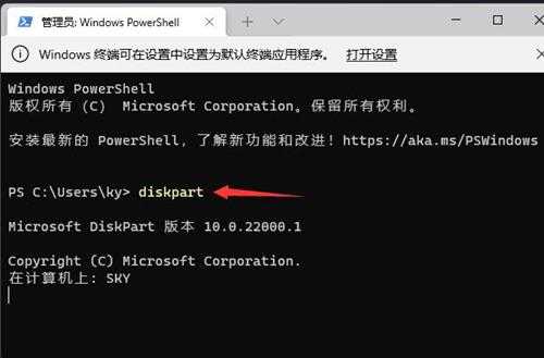 2、管理员: Windows PowerShell窗口,输入并按回车执行 diskpart 命令。如图所示: